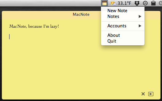 Are you looking for a simple and quick way to enter notes into the Apple’s Notes.app application from the statusbar? Don’t want the extra features of big note tools or really just like Apple’s built in Notes app? Me too! So I wrote a little utility I call MacNote to allow quick note entry to the Notes.app! Simply select your account, local or otherwise, and you’re all set.