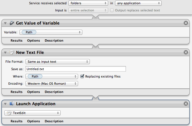 If you want to automate this in the GUI use the Automator app that’s included with OS X. We will end up with a service that will let us create and open a new text file on the desktop from anywhere. It will look a like this, and there is no programming required at all.