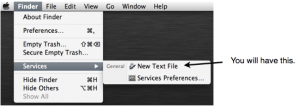 If you moved from Windows to Macintosh you may miss the create text file right click menu. Well, I work a lot form the Desktop when messing with files and programming, because it’s easier than having Finder windows all over the place so when I create a empty text file I usually create it on the desktop. I do this by hitting: