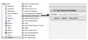 To your left you will see the library items and we need at least two. The first is the “Get value of variable” in Utilities. Drag “Get value of variable” to the main window.