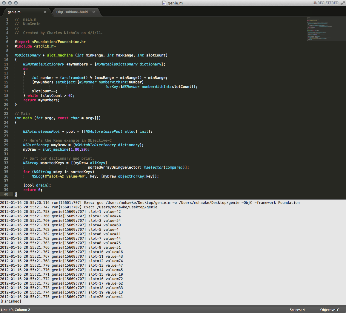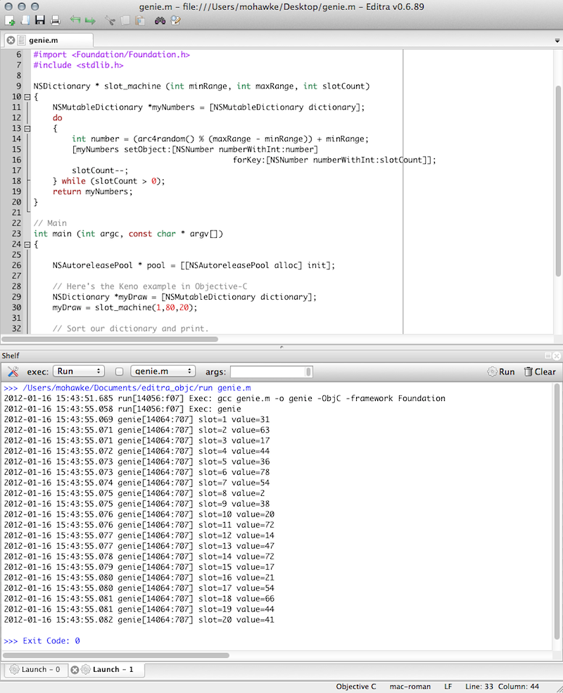 As I’m learning Objective-C I find moving between the terminal and my favorite IDE, Editra kind of annoying. Luckily Editra has a really cool plug-in called Launch that can be configured to run code and display the results within the editor. The only problem is that compiling and running objective-c doesn’t work for a couple of reasons. No big deal, I wrote a simple command line program to compile and run the code returning any output. This will work on the command line and I also use it in Sublime Text 2 .
