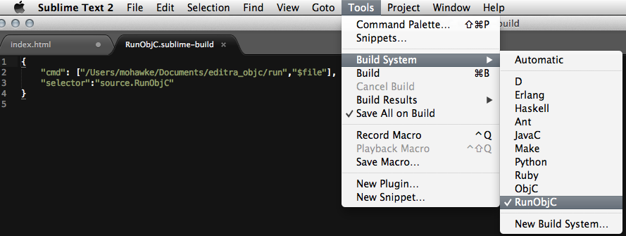 There are two versions, one simple compiles and the other compiles and executes the program and returns results if any. This can be used at the terminal giving it only the script you wish to compile. See the images below for Editra and Sublime setups, changing to your path of course. This is for simple scripts (.m) for simple programs and learning, I’d use XCode for serious dev.
