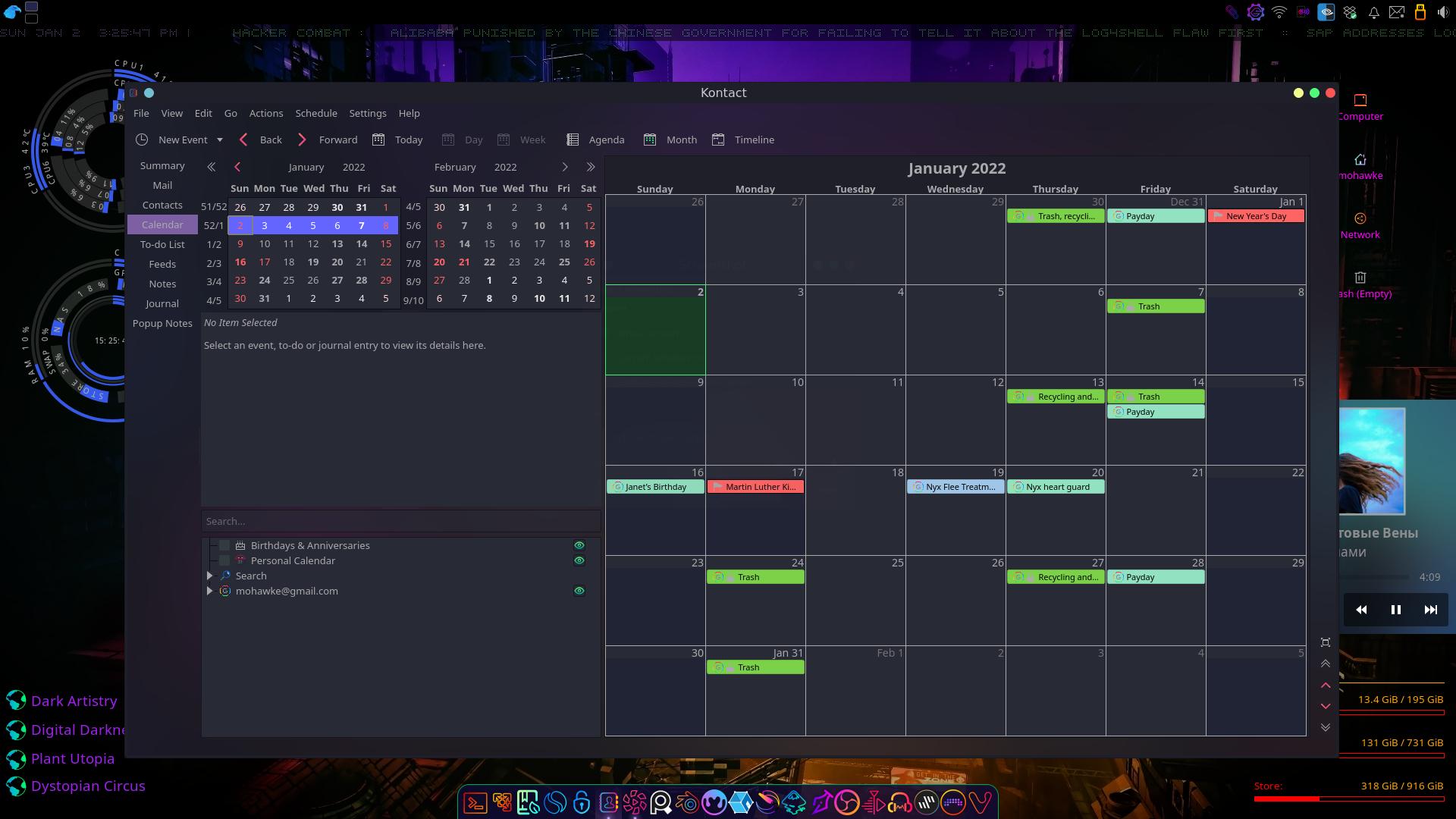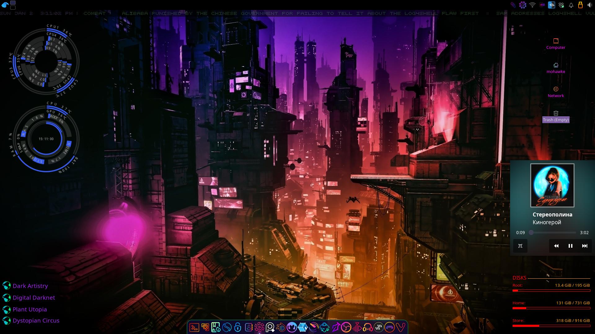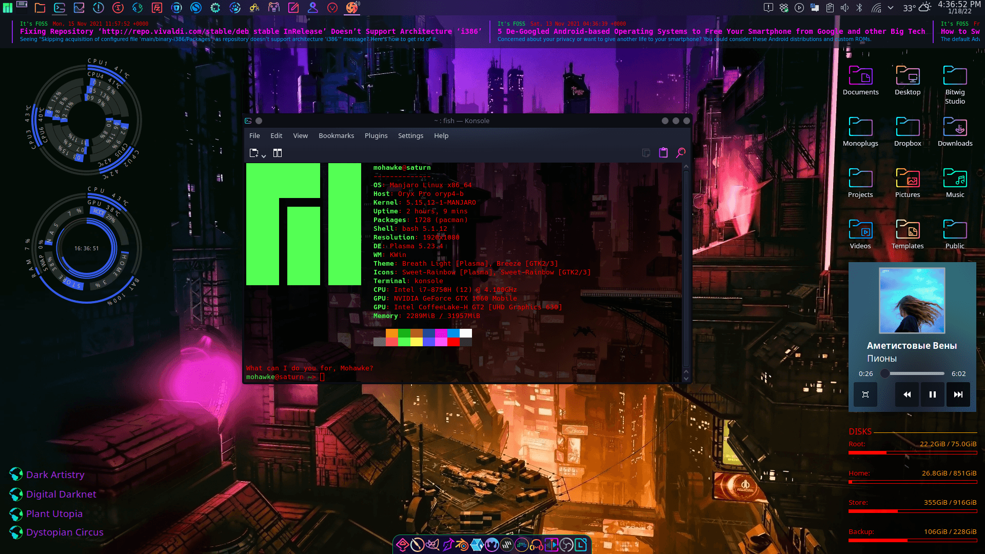 - Running plank, conky, and Plasma widgets for desktop candy. I wrote some conky conf and changed the Lua script for the circular system monitor.