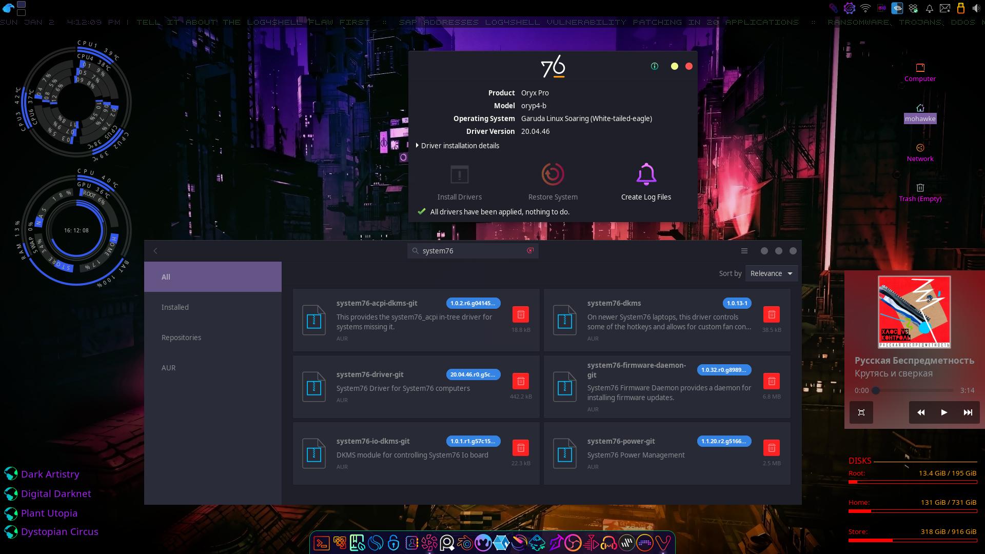 I am on an older System 76 Oryx Pro and needed the drivers and such from AUR or the fans were crazy, no keyboard back-light, no sensor data, etc. Got all that working and it all works well. Let me just stop here and say that the next big update will likely break everything on this laptop! Period. If you want a really stable machine with miner bleeding edge headaches go with Manjaro. That’s all I will say. For now it runs great and the only thing I could not get to work is Kmail storing my SMTP password. I see it in KWallet and everything else works.