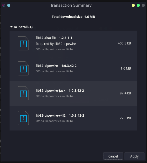 Pipewire is installed by default and it is flawless so far but if you don’t have sound in Wine or Lutris games see the below image for the packages you need to get it working. I also switched to Wireplumber. The only issue left to fix around the audio stuff is with Pigments Windows VST served by Yabridge causing Bitwig to freeze, it’s not really audio related.