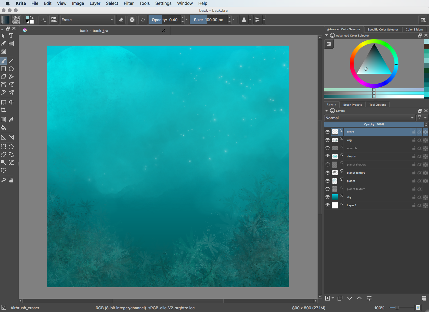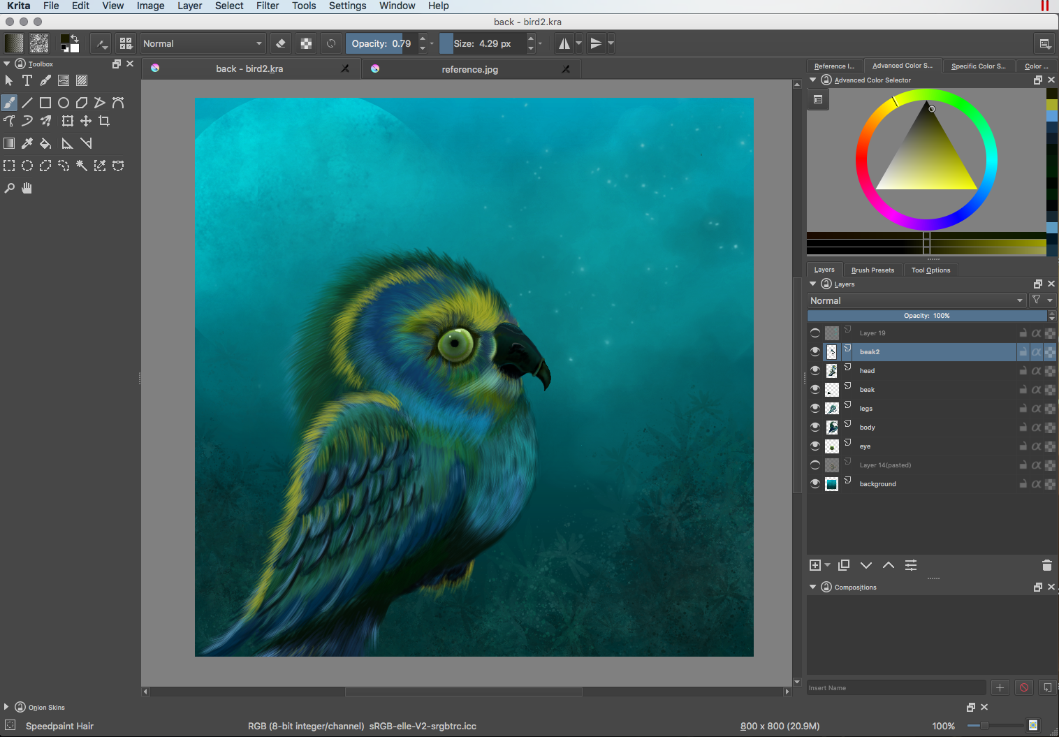It has been a long time since I checked out Krita. I Painted this in Krita 3.1.1 on Mac Yosemite, versions for Windows as well and of course Linux; all are free. The bird took about six hours, give or take, and the program was not shut down for two days. I had one lock up during export of the final PNG save, no problems with the tools or app other than that. Be sure to save often, just in case. I used the following brushes, available here:
