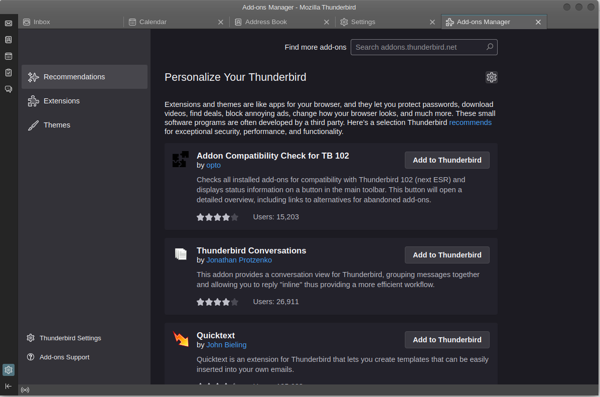 Now I am not sure if Thunderbird already had a dark theme, I assumed it did through the theme engine and I vaguely remember adding themes back in the day, but it started with a dark theme and that I like. Light backgrounds tend to bother my eyes. It is also not a Gtk app so it will not pick up the Gnome themes but it fit my system theme fine by default. Considering it is built off Firefox, adding themes and extensions is a similar process to the browser, along with the same security concerns.