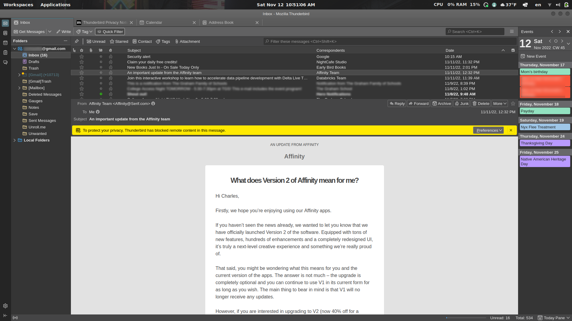 Built in calendar, tasks, chat, and news reader all worked without any issues. Of course mail was fine too. My experience, beyond some layout differences, was very much the same as Evolution. Events and tasks display in Gnome’s top bar calendar and notifications worked as expected. It likely integrates with other desktop managers as well considering it’s a rather generic application. For me the experience using Thunderbird was good but so similar to Evolution I see no reason to switch.