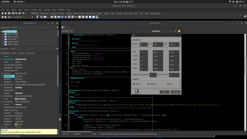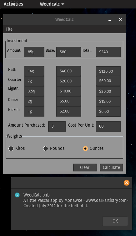My son was home sick today and I had to take the day off so I decided to take this time to learn a little Pascal and Lazarus cross development. I actually couldn’t think of anything so after running into a forum post about marijuana and amounts the other day I thought, why not write a program to do this? It’s sloppy at best, may have bugs or errors, but it’s free and it works as far as I can tell. I’m also not a weed person so what the community needs and what I think they might need may differ. If you think this could be useful though, feel free to let me know.